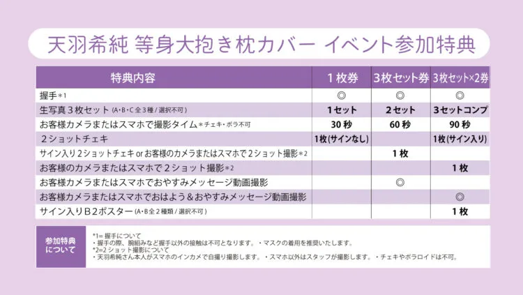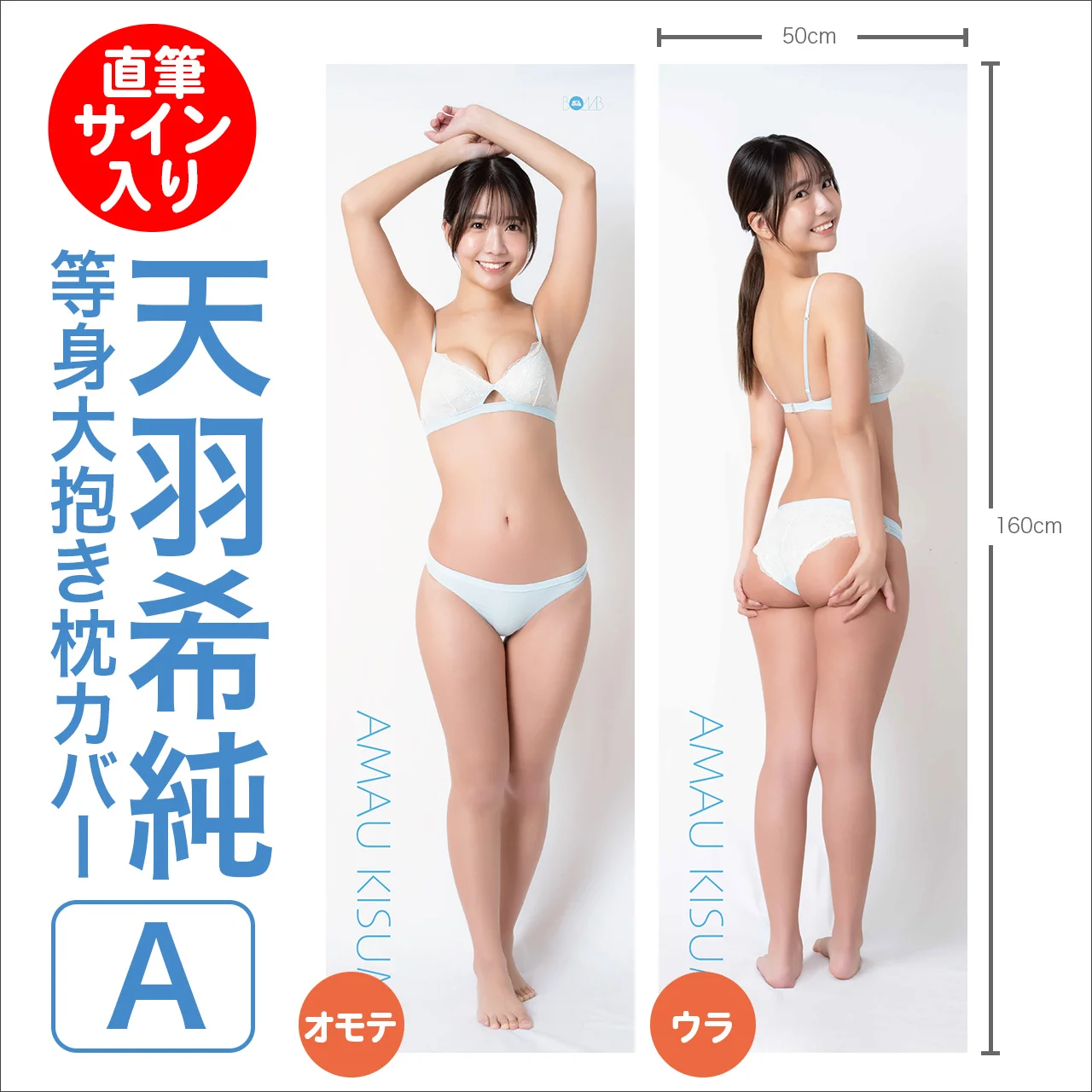 | データ | 等身大抱き枕カバー全3種(両面) モデル:天羽希純 サイズ:たて約160cm×よこ50cm 素材:2wayトリコット 価格:各14,500円(税込) ※枕の中身は付属しません。 |