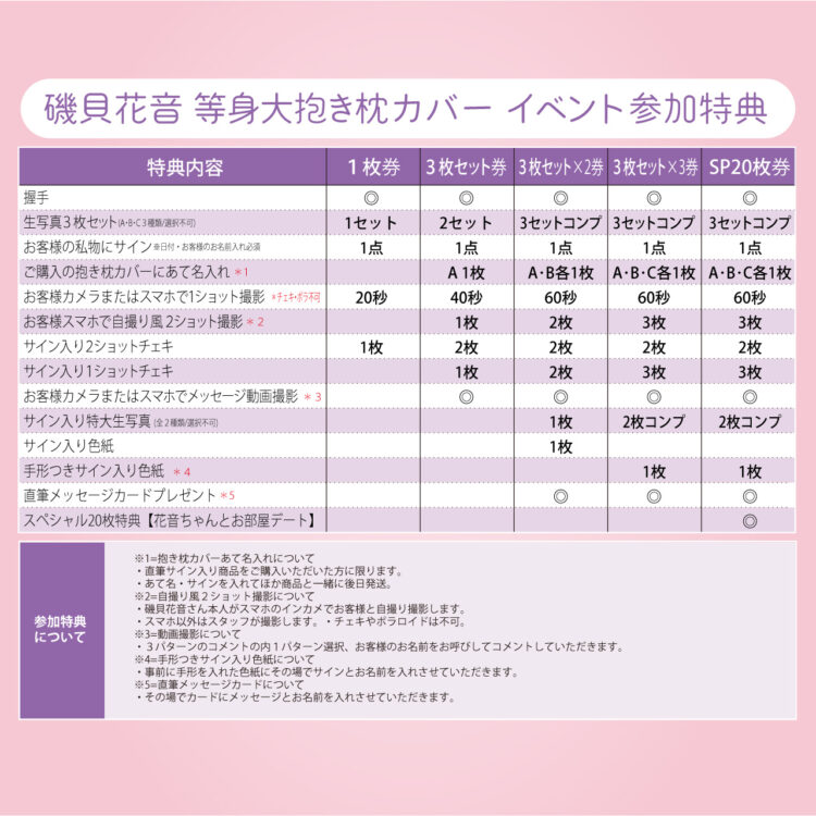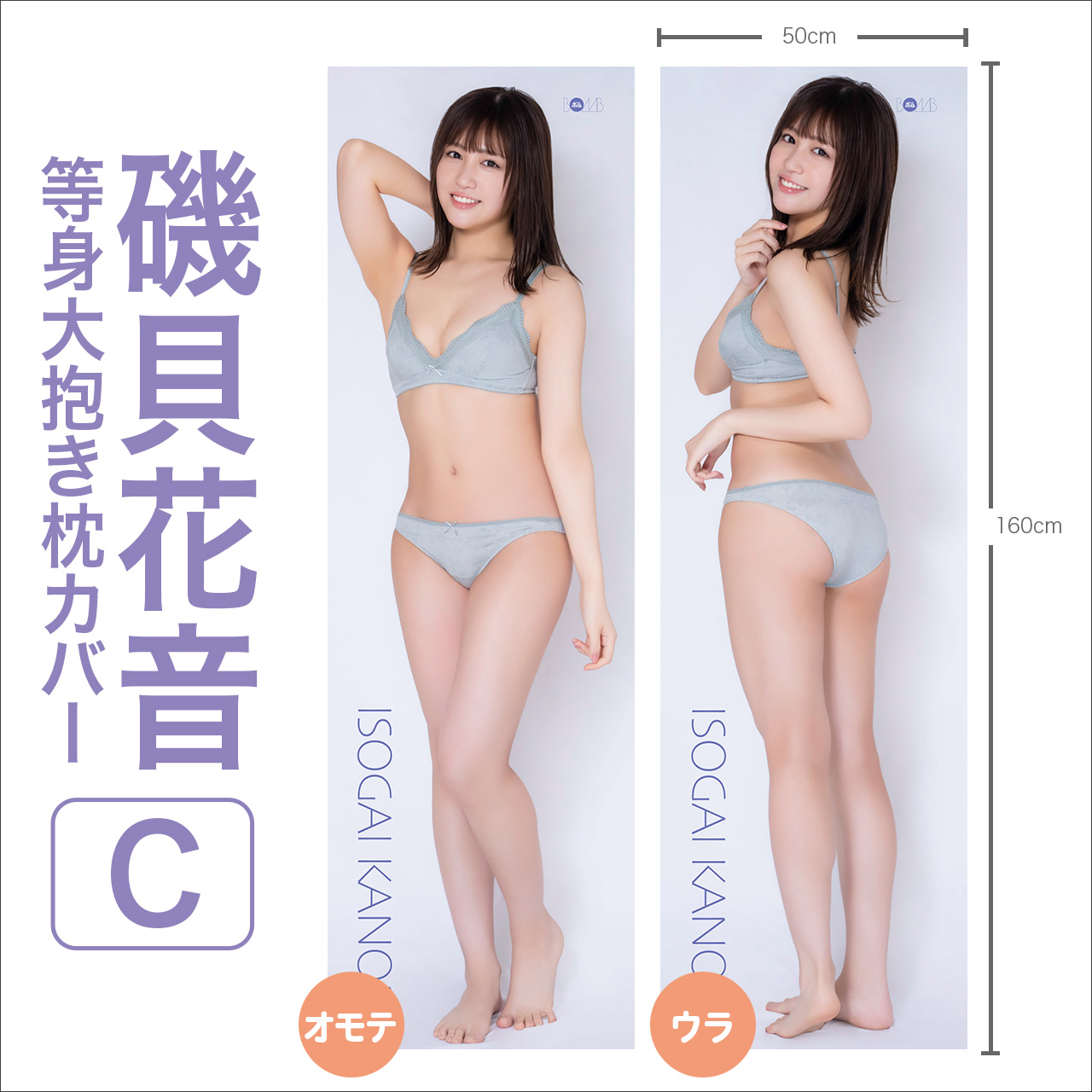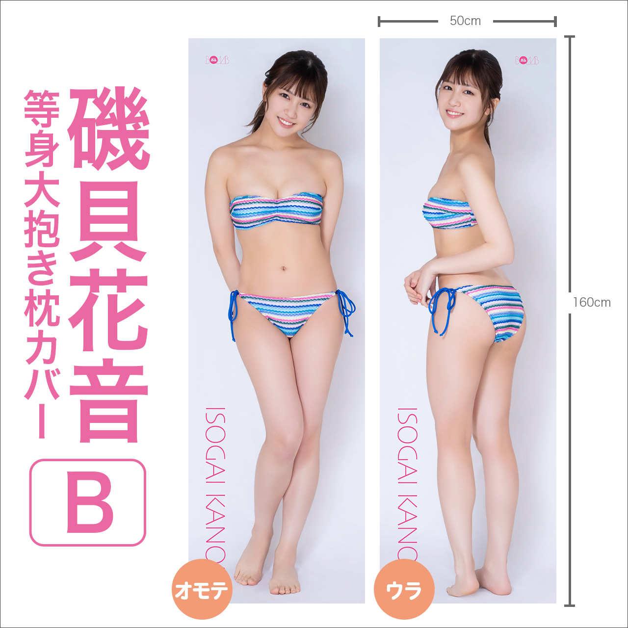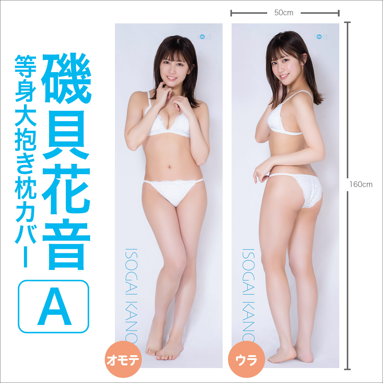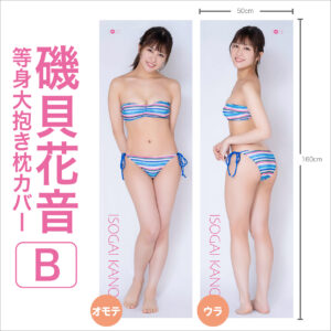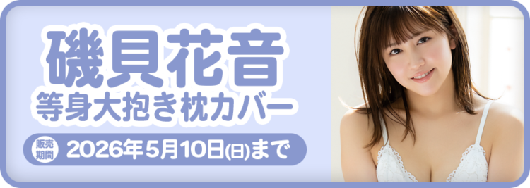 | データ | 等身大抱き枕カバー全3種(両面) モデル:磯貝花音 サイズ:たて約160cm×よこ50cm 素材:2wayトリコット 価格:各14,500円(税込) ※枕の中身は付属しません。 |